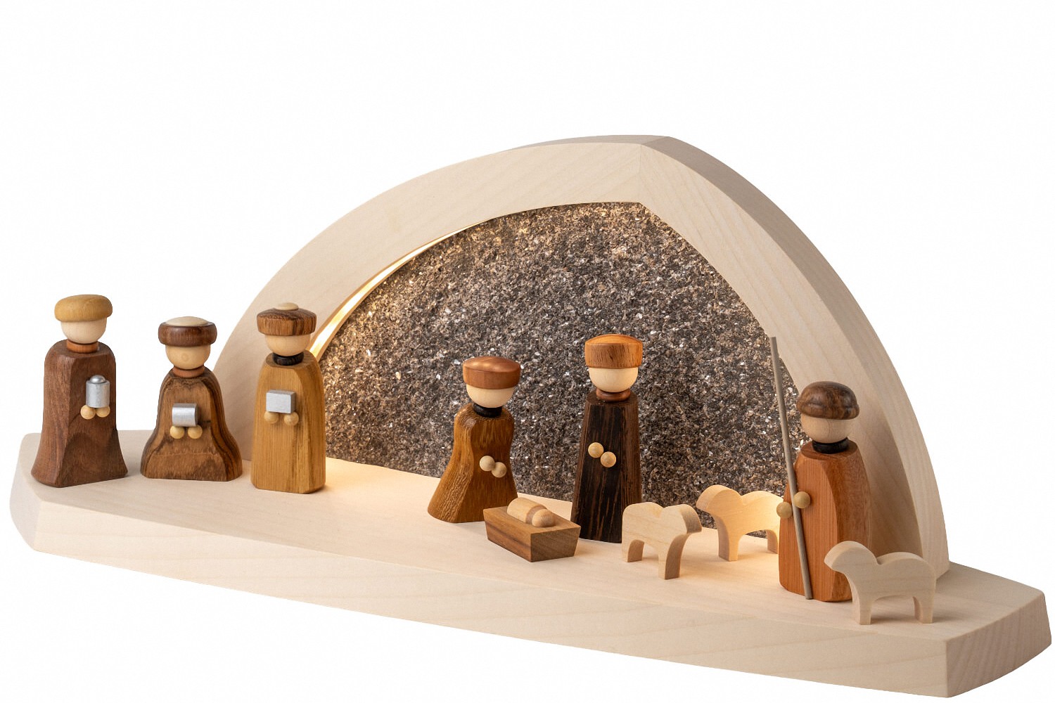 Эта светодиодная скальная арка спокойно и достойно рассказывает рождественскую историю, где изображение рождения Христа кажется собранным и сбалансированным; Натуральные фигуры и чёткий дизайн привлекают внимание к основному и создают пространство для размышлений. В центре внимания — Мария, Иосиф и младенец Иисус, дополненные волхвами и пастухом с тремя овцами, которые придают сцене глубину и смысл; Все фигуры выполнены в различных естественных тонах и сознательно спроектированы так, чтобы их сдержали и создали гармоничную общую картину, которая тихо повествовалась и не была поставлена. Скальная арка выполнена из дерева и имеет заднюю стену из настоящего камня, что придаёт композиции глубину и спокойный, землистый эффект, а дерево и камень вступают в захватывающий диалог и придают сцене плотный, качественный каркас. Арка, изготовленная компанией Seiffener Volkskunst eG в курортном городе Зайффен, сочетает в себе традиции эрцгебирге с современным дизайном, с тщательной работой, чёткими линиями и сбалансированными пропорциями, характерными для высокого качества общего впечатления. Интегрированная светодиодная лента с тёплым белым светом 3000 Кельвина мягко и равномерно освещает сцену, подчёркивая спокойную атмосферу, не выходя на передний план; он питается от USB-C, разъём питания не входит, а модель относится к классу энергоэффективности G. С размерами 15 x 37 x 13 см, светодиодная каменная арка идеально подходит для подоконников, сервантов или тихих жилых зон и создана как качественный световой элемент, который сопровождает рождественский сезон тихой и праздничной атмосферой.