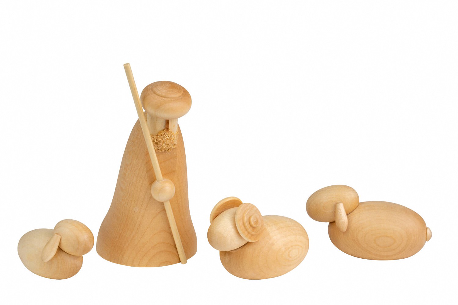 Стоящий на коленях пастух с овцами показывает особенно интимный момент вертепской сцены. Его осанка сочетает в себе спокойствие, осознанность и тихую преданность, что придаёт образу мягкий, почти личный оттенок. Естественная окраска подчёркивает спокойный характер и делает сцену тёплой и сбалансированной. Созданная в народном искусстве Зейфена по эскизам Шаллинга, эта фигура создана в курортном городе Зайффен. Дизайн выполнен в традиционном стиле рождества Шаллинга, основанном на чётких формах, сбалансированных пропорциях и сдержанной выразительности. Четырёхчастная группа фигур состоит из стоящего на коленях пастуха и трёх овец, изображённых спокойно. Поза на коленях создаёт иной эффект, чем у стоячих фигур: взгляд опускается, сцена приобретает близость и внутренний покой. При высоте 9 см эта группа фигур идеально подходит для небольших вертепских сцен Шаллинга или как специально размещённая точка отдыха внутри более крупной вертепской сцены. Она комплиментирует других пастушьих фигур, не вытесняя себя на передний план. Стоящий на коленях пастух с овцами символизирует скромность, тихую заботу и тихие моменты рождественской истории.
