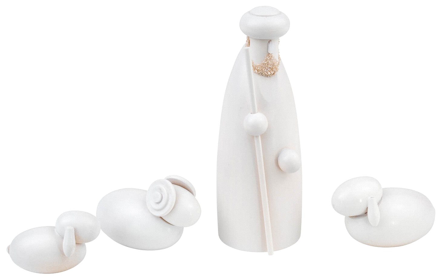 Стоящий пастух с овцами — один из тихих, поддерживающих мотивов классической вертепской сцены. В белом цвете эта четырёхчастная группа фигур излучает особое спокойствие и придаёт сцене ясную, сдержанную ауру. Изготовленная в народном искусстве Зейфена по эскизам Шаллинга, эта группа фигур создаётся в курортном городе Зайффен. Традиционный дизайн следует чёткому языку дизайна, который намеренно акцентирует внимание на сдержанности и подчёркивает характер вертества. Пастух стоит прямо со своими тремя овцами. Фигуры гармонично скоординированы друг с другом и вместе образуют замкнутую сцену. Белая поверхность подчёркивает контуры и формы, делая группу фигур особенно сбалансированной. С высотой 12 см эта фигурка вертеп подходит для средних и крупных рождественных пейзажей. Его можно гибко размещать, и он вписывается как в традиционные, так и в современные концепции рождества.