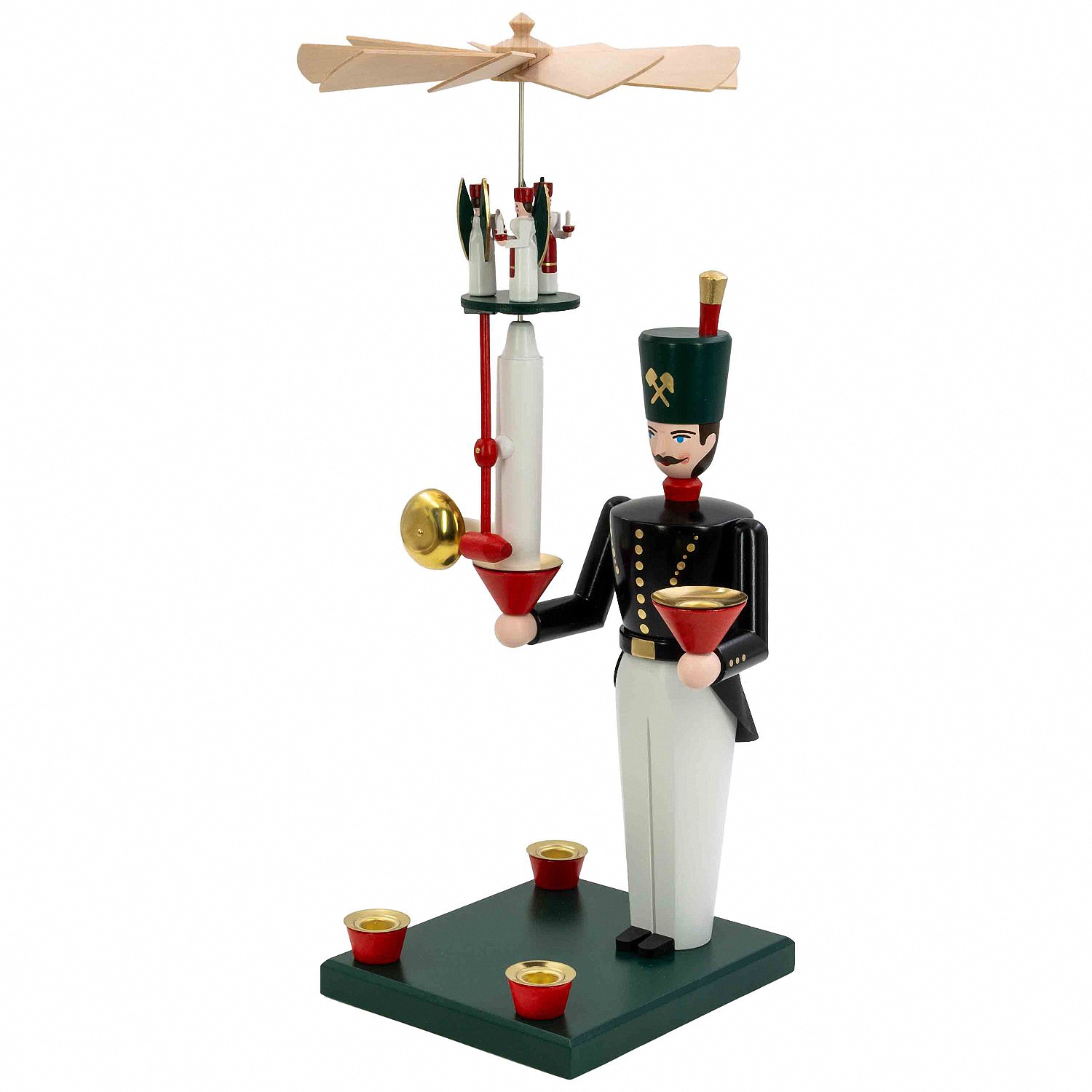 Колокольный шахтер является особо артистичной фигурой рождественской традиции Рудных гор и в то же время шедевром механики. Выполненный в классическом костюме шахтера, он держит подсвечник в одной руке и искусно выполненную миниатюрную пирамиду в другой, которая является декоративной и функциональной одновременно. Как только тепло свечей поднимается, пирамида начинает мягко вращаться, а хитроумный механизм запускает бой маленького золотого колокольчика – тонкой акустической детали, которая делает эту фигуру особенной. Механизм создан исключительно по традиционному принципу пирамидальных крыльев, без какой-либо электроники. Эта светлая фигура высотой 40 см изготовлена вручную, расписана и собрана с большим техническим мастерством, сочетает в себе классические формы с утонченным движением и делает свет Рождества впечатляющим образом.
